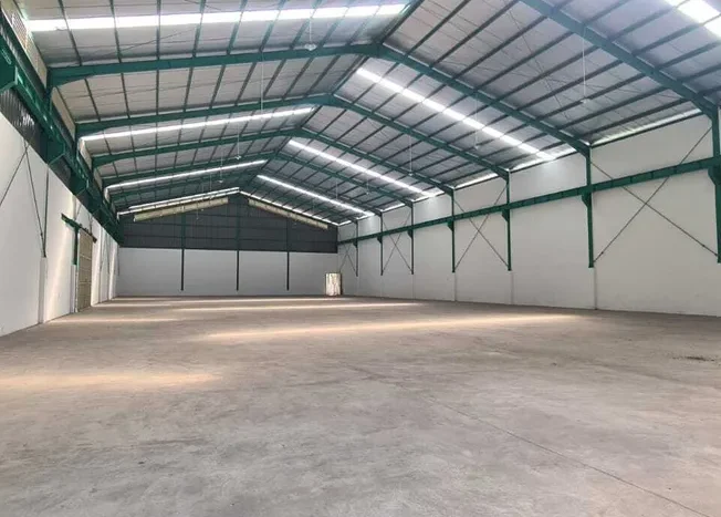 - Konstruksi & Bangunan: Dibangun 100% baru dengan kerangka konstruksi baja WF untuk ketahanan maksimal. Dilengkapi dengan lantai cor K300 yang sangat kuat, mampu menahan beban berat, dan atap setinggi 9.5 meter, memberikan ruang vertikal yang luas untuk penyimpanan tinggi atau penggunaan mezzanine.
